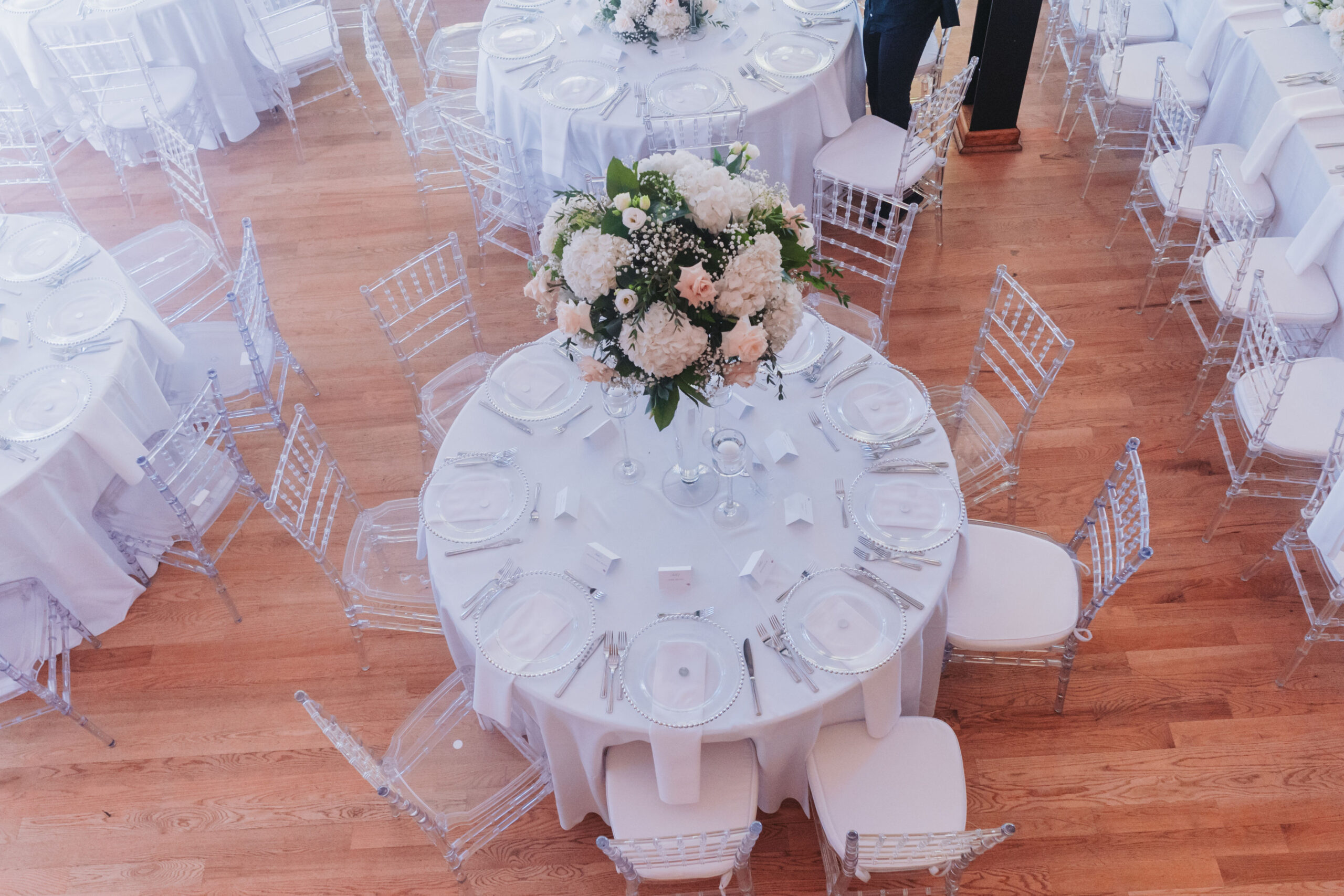 Soft pinks and whites filled the room, a delicate color palette that brought a romantic freshness to the celebration. Every detail, from the floral arrangements to the table styling, reflected a modern garden elegance that perfectly matched the couple’s personality.